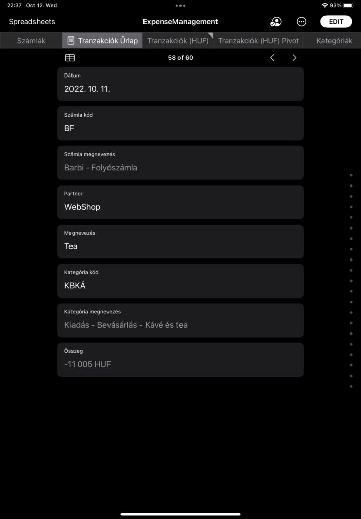 Ha a fájlt egyébként megnyitod iPhone/iPad-en, akkor a Tranzakciók (HUF) munkalappól kiindulva lehet csinálni egy űrlapot (form-ot), aminek a segítségével gyorsítható és egyszerűsíthető az adatrögzítés. ;) Így néz ki: